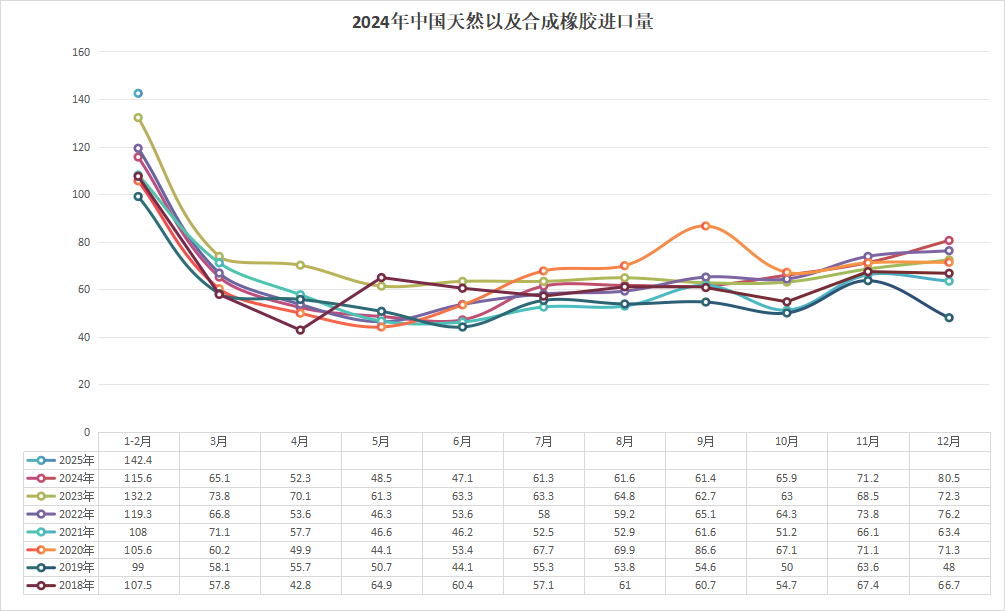 据中国海关总署3月7日公布的数据显示,2025年1至2月中国进口天然及合成橡胶(含胶乳)合计142.4万吨,同比增23.3%。2024年同期进口量为115.5万吨。