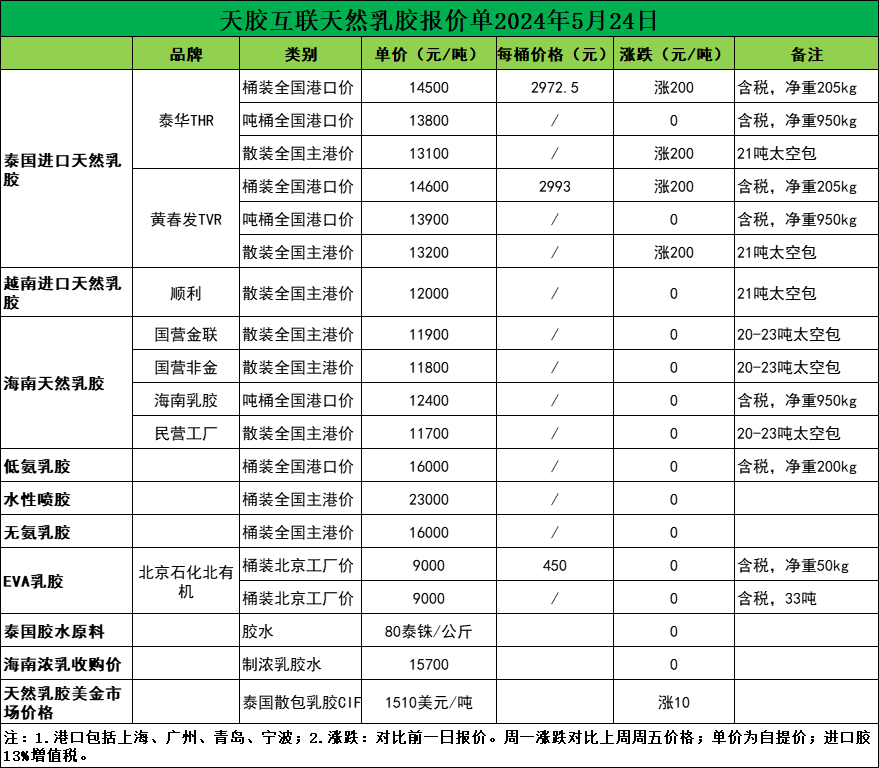 小幅涨价!天然乳胶现货价格(2024.05.24)