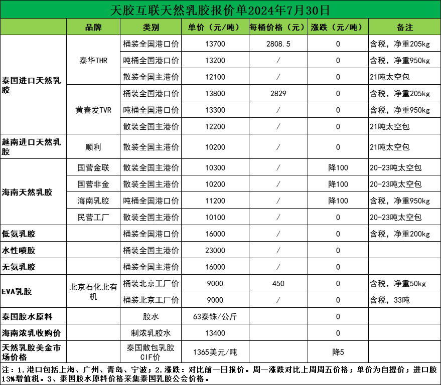 涨跌不大!天然乳胶现货价格(2024.7.30)