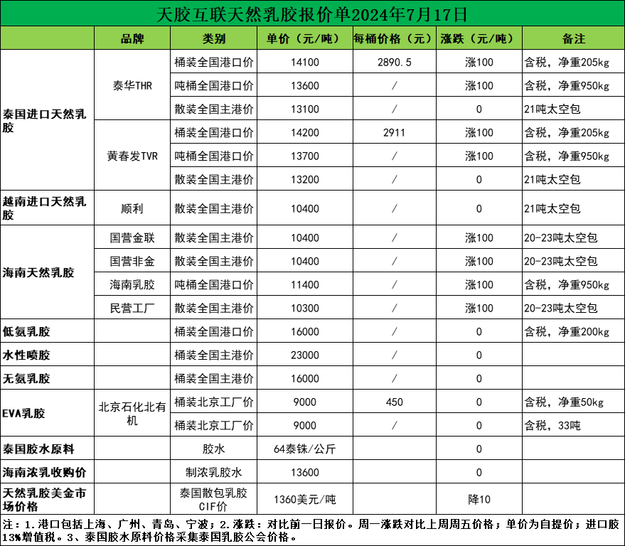 每吨涨价100元!天然乳胶现货价格(2024.7.17)