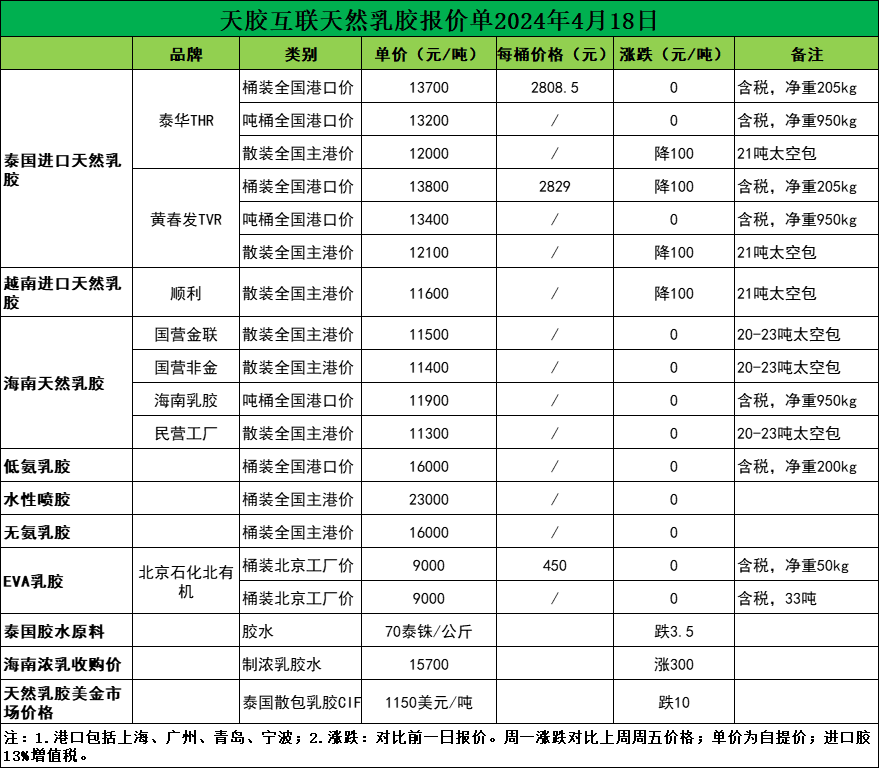 每吨降价100元!天然乳胶现货价格(2024.04.18)