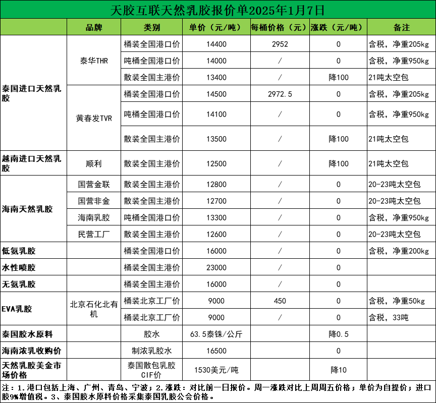 继续小幅降价100元/吨!天然乳胶现货价格(2025.01.07)