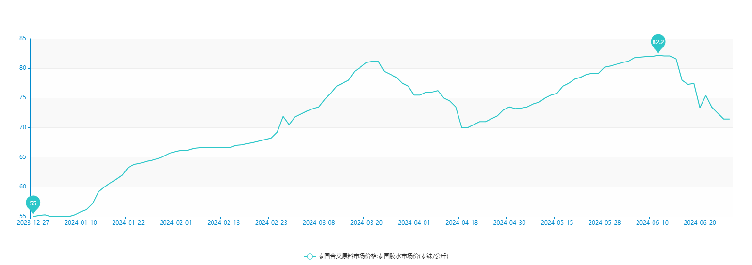 泰国胶水原料价格上涨15泰铢/公斤,从年初的55泰铢/公斤,高位涨到了82.2泰铢/公斤。今年上半年泰国胶水原料价格在80泰铢以上的区间维持了18天,将近3个星期。从3月份开始至今,一直维持在70泰铢以上的区间。