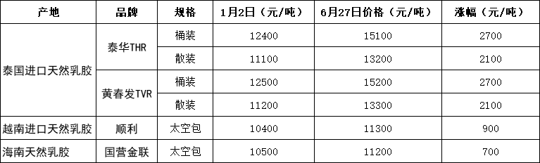 从年初截止到6月27日,泰国进口乳胶桶装涨价2700元/吨,散装涨价2100元/吨,越南进口乳胶涨价900元/吨,国产乳胶涨价700元/吨。泰国进口乳胶的涨幅明显高于越南进口和国产乳胶。