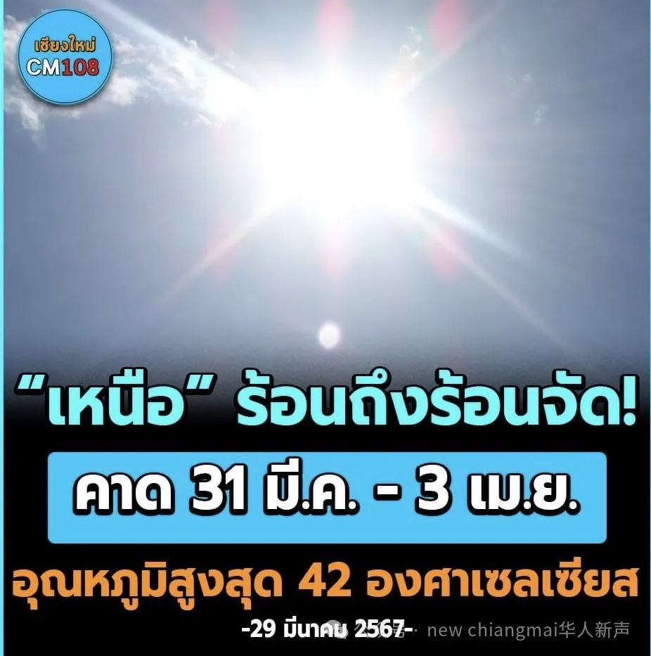 根据泰国相关媒体报道,当地气象部门预测,3月31日-4月3日泰国北部地区将出现炎热的酷暑天气,高气温将达到42摄氏度。