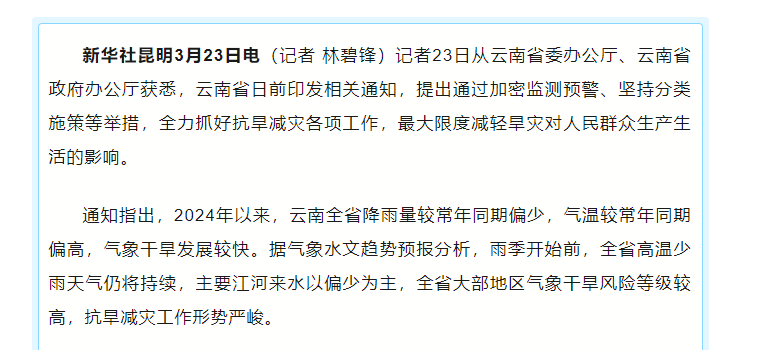 其实,3月份的时候,国内已经炒作过云南干旱,目前云南旱情仍然在持续中。根据当地官方资料显示,“据气象水文趋势预报分析,雨季开始前,全省高温少雨天气仍将持续,主要江河来水以偏少为主,全省大部地区气象干旱风险等级较高,抗旱减灾工作形势严峻。”