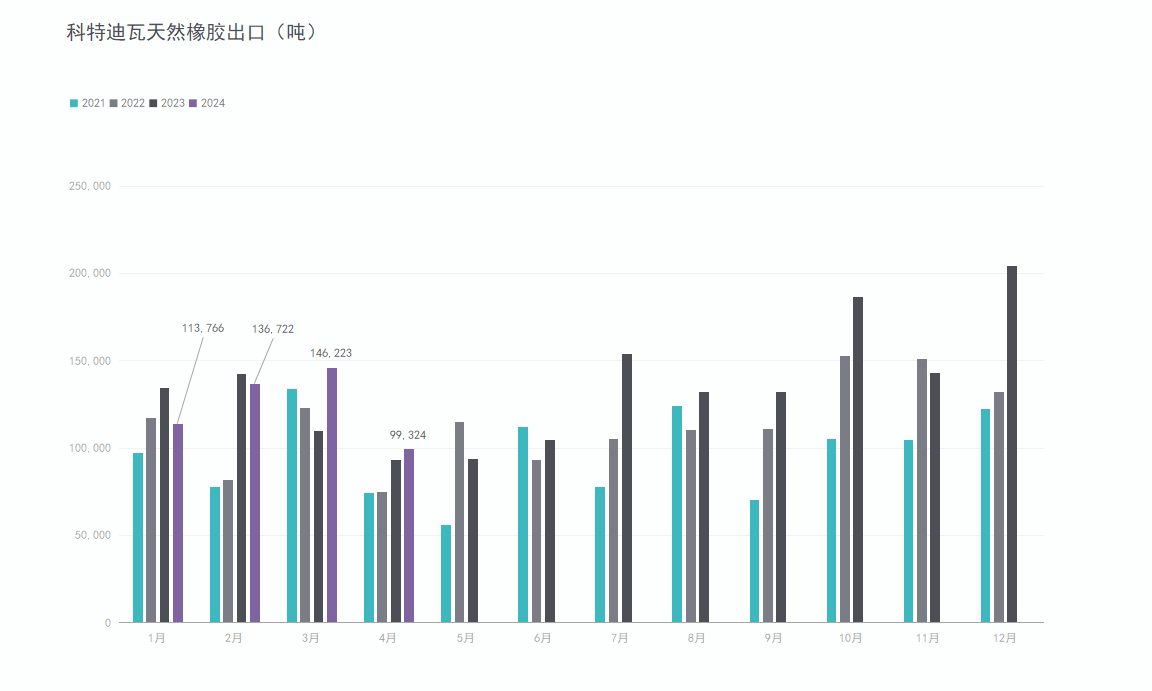 4月,非洲产胶国科特迪瓦橡胶出口99324吨,今年