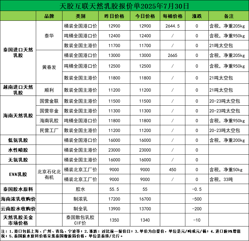价格暂无变化!天然乳胶现货价格(2025.07.30)