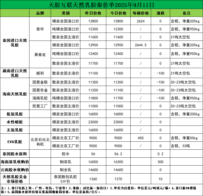 涨跌不大!天然乳胶现货价格(2025.09.11)
