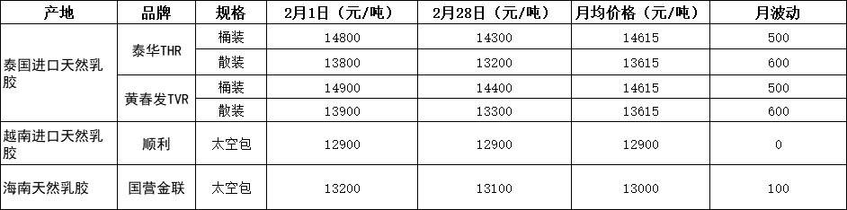 由于原料价格高位,使得今年2月份天然乳胶价格维持高位。泰国进口乳胶桶装在14300-14900之间,散装在13200-13900之间,越南进口乳胶在12900-13000,国产乳胶在13100-13500之间。从近几年的价格走势来看,今年2月份价格的确很平稳,尤其是国产乳胶和越南进口乳胶,几乎没什么价格变化。泰国进口乳胶小幅降价,但每吨降幅也只有五六百元左右。