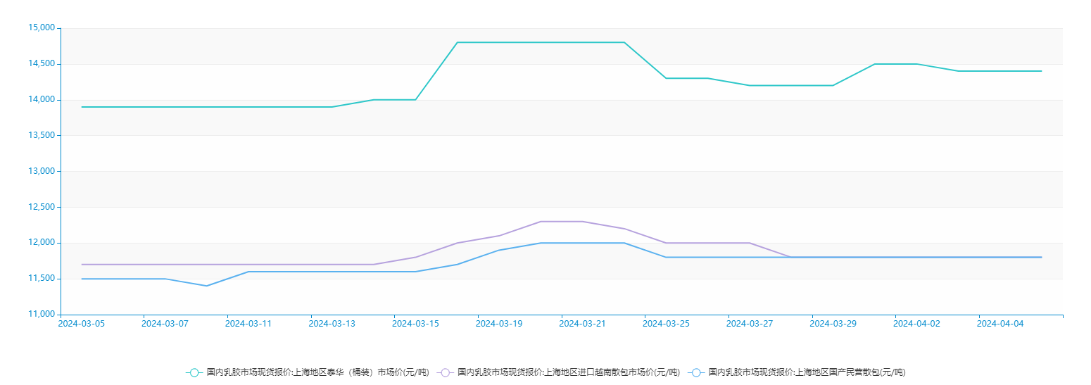 本周由于清明假期,所以只有周一到周三开盘,但三天基本上处于震荡下跌行情之中,目前已经跌至14500附近。橡胶期货震荡下跌,天然乳胶现货降价。截止到周三,泰华THR桶装13900元/吨,黄春发桶装14000元/吨;泰华THR散装(太空包)12400元/吨,黄春发散装(太空包)12500元/吨。越南进口乳胶报11700元/吨,国产乳胶报11300-11600元/吨。价格已经从高位回落不少,泰国进口乳跌桶装破一万四整数关口。1、印尼前2个月天胶、混合胶合计出口量同比降18.8%!2024年前2个月,印尼出口天然橡胶(不含复合橡胶)合计为26.1万吨,同比降18%。其中,标胶出口25.6万吨,同比降18%;烟片胶出口0.5万吨,同比降17%;乳胶出口0.03万吨,同比降80%。1-2月,出口到中国天然橡胶合计为1.6万吨,同比降73%;混合胶出口到中国合计为0.2万吨,同比降50%。综合来看,印尼前2个月天然橡胶、混合胶合计出口26.3万吨,同比下降18.8%;合计出口到中国1.8万吨,同比降72%。2、3月马来西亚沙巴和砂拉越州橡胶生产津贴(IPG)已启动!据马来西亚4月1日消息,马来西亚橡胶局(MRB)宣布,已启动2024年3月针对沙巴州和砂拉越州小农的橡胶生产津贴(IPG)。当局在一份声明中表示,3月份半岛、沙巴和砂拉越杯胶(干胶含量50%)的农场交货平均价格分别为每公斤3.20令吉、2.85令吉和2.70令吉。天然橡胶总库存较上周减少250吨至216941吨;仓单库存较上周增加830吨至211960吨。本周泰国胶水原料价格回落不多,偏稳定,目前报76.25泰铢/公斤,周内并没有下跌,反而出现小幅上涨,上涨0.75泰铢/公斤。胶水原料价格的稳定意味着当前供需偏稳,泰国暂未开割,胶水原料偏少,而加工厂仍然在高价收购胶水。胶水价格震荡。国内产区云南已经开割,但云南一则以干胶为主,对乳胶市场影响较小。除此之外,云南开割初期,由于当地干旱,部分林场据说已经开割之后再次休割。海南产区要到4月中旬之后开割,目前还在开割前夜,下周看能不能顺利开割。虽然胶水原料价格已经出现拐点,并且处于下行趋势,但未开割之前,价格不可能快速下跌。而且目前的价格依旧处于高位区间。泰国胶水原料价格60泰铢/公斤以上属于高位区间,这将对天然乳胶成品价格仍然有支撑。4月初的行情其实延续了3月份的市场行情,很多客户在春节之前大量囤货,部分客户都能用到5月份,所以说我们预计4月份上半月行情可能一般。下半月可能好于上半月。除此之外,因为价格存在下跌预期,都在等待开割后,天然乳胶价格回调后做采购计划。据业内人士的调研数据,目前开工率维持在5-6成的水平。云南开割又休割,外盘依旧偏强,不排除国内橡胶期货下周开盘继续炒作干旱,引起市场的波动,从而带动现货价格的涨涨跌跌。从趋势来看,天然乳胶价格处于下跌态势之中,但是不会那么快下跌,除非胶水原料价格和橡胶期货共振下跌,才会快速下跌。下周暂时不会出现在这种情况,原料毕竟还在高位,周内还出现了小幅反弹。所以下周天然乳胶现货价格震荡降价为主,不过要随时注意橡胶期货的波动,如果资金炒作期货,那么,天然乳胶现货价格可能还有波动。以上纯属个人分析,不构成投资建议,投资者据此投资,投资风险自我承担。