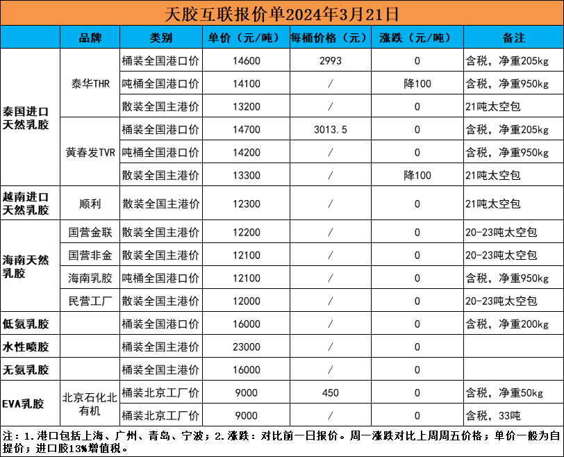 部分品牌价格略降!天然乳胶现货价格(2024.03.21)