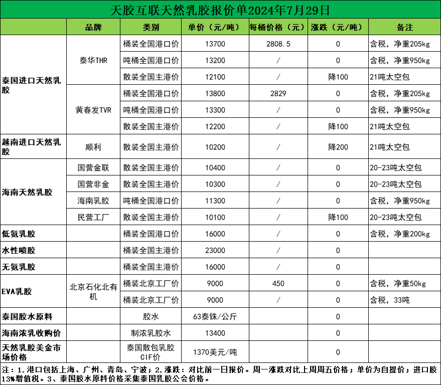 每吨降价100元!天然乳胶现货价格(2024.7.29)