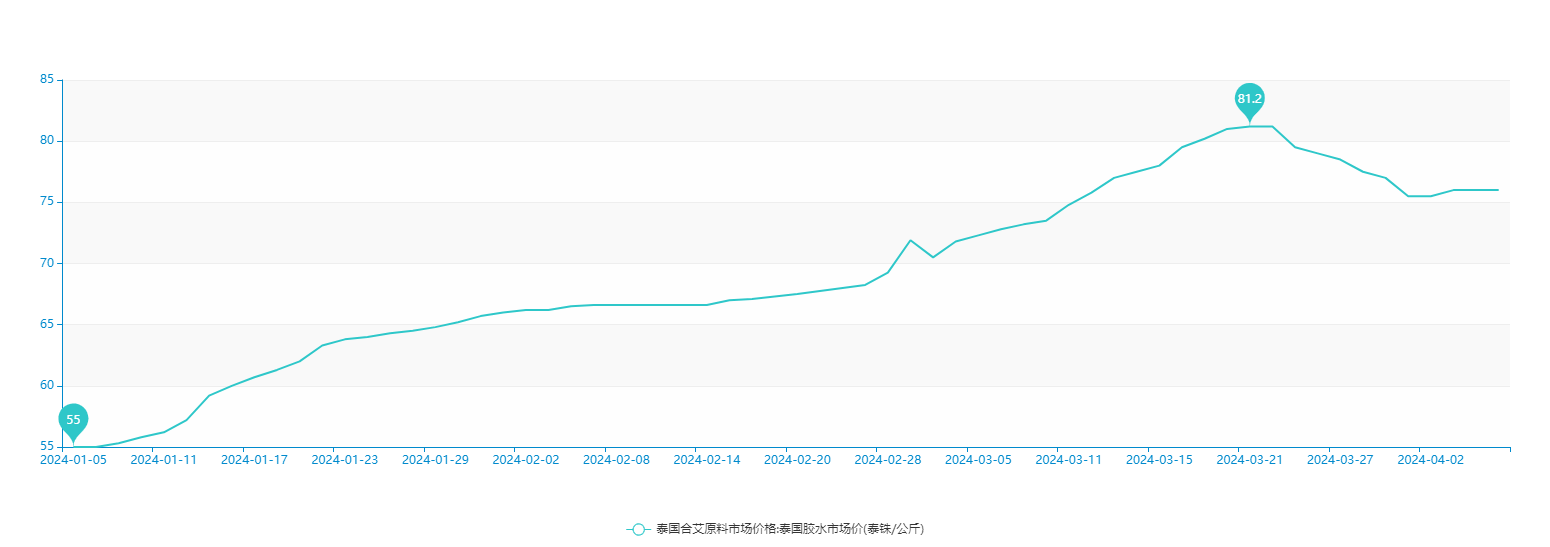2024年1月2日,泰国胶水原料价格报53.3泰铢/公斤,3月29日报77泰铢/公斤,一季度胶水原料价格涨23.7泰铢/公斤,涨幅44%,创多年以来新高。