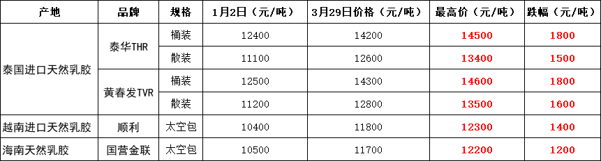 泰国进口乳胶桶装涨1800元/吨,散装涨1500-1600元/吨;越南进口乳胶涨1400元/吨;国产乳胶涨1200元/吨。泰国进口乳胶桶装高位报14500-14600元/吨,散装高位报13400-13500元/吨;越南进口乳胶高位报12300元/吨;国产乳胶高位报12200元/吨。