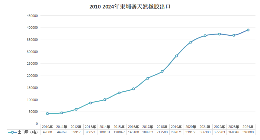 2、柬埔寨天然橡胶出口增长明显。从2010年的4.2万吨,增长到2024年的大概39万吨,14年时间出口增长828%,增加34.8万吨。出口量几乎是逐年增长的态势。柬埔寨天然橡胶出口增长主要原因在于产量的提升。