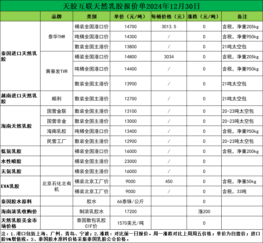 暂无变化!天然乳胶现货价格(2024.12.30)