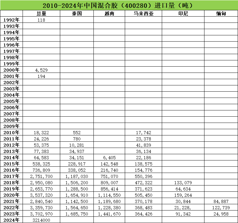 我们已经分析1992年以来中国天然橡胶进口量,包括总量,分类的标胶和天然乳胶,标胶主要关乎到20号胶。现在我们继续分享混合胶。2010年之前,中国混合胶进口量很少,所以没有罗列相关数据,没啥意义。以下是2010-2024年中国混合胶进口量: