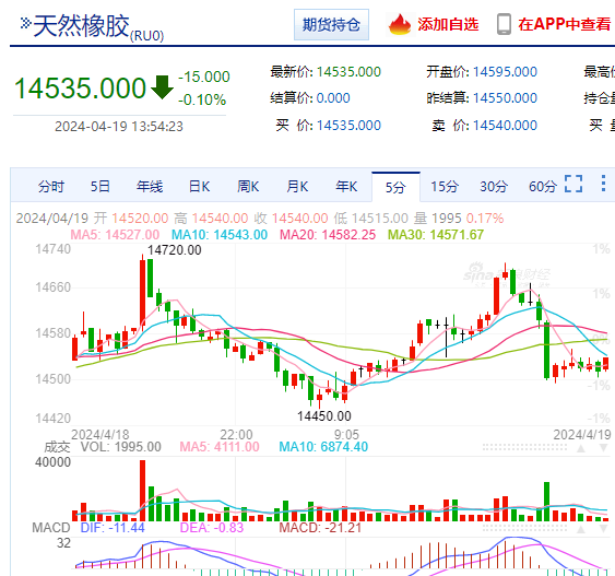 橡胶期货上午受以色列和伊朗之间消息面的影响,从低位的14460附近,高位上涨到14700附近,然后冲高回落,又跌至14500附近。上演了过山车式的一涨一跌,波动超过200点。橡胶期货的走势反反复复,目前在这个位置区间已经持续了一周的时间。