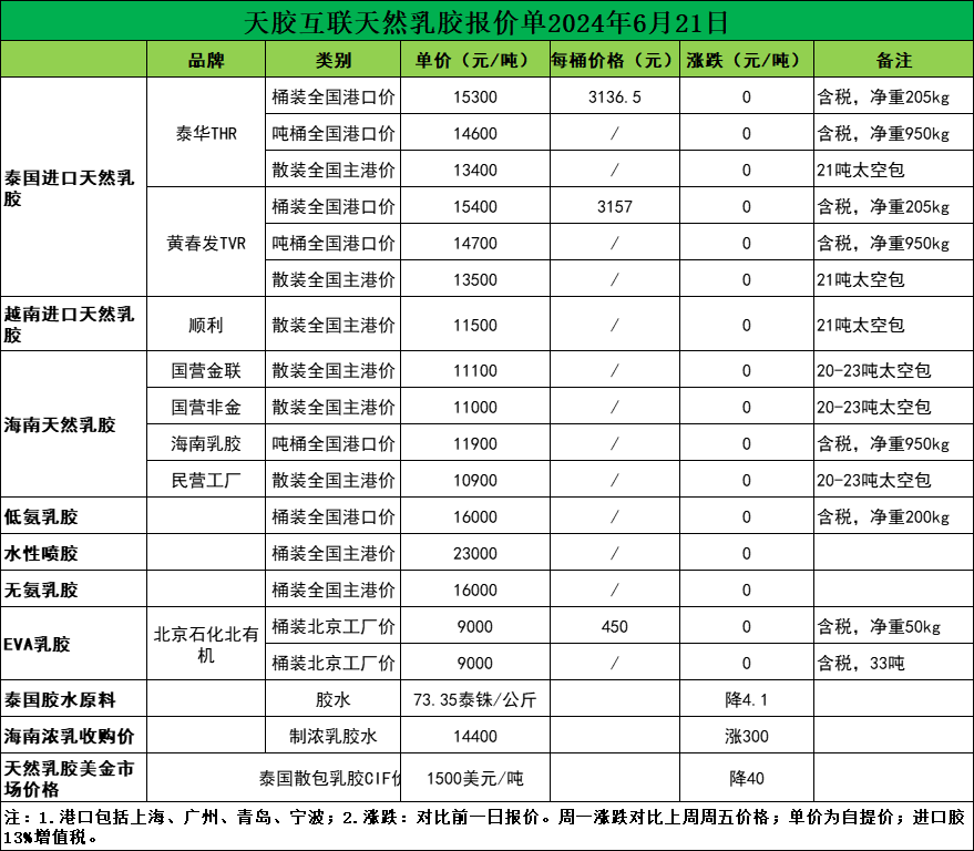 价格暂无变化!天然乳胶现货价格(2024.6.21)