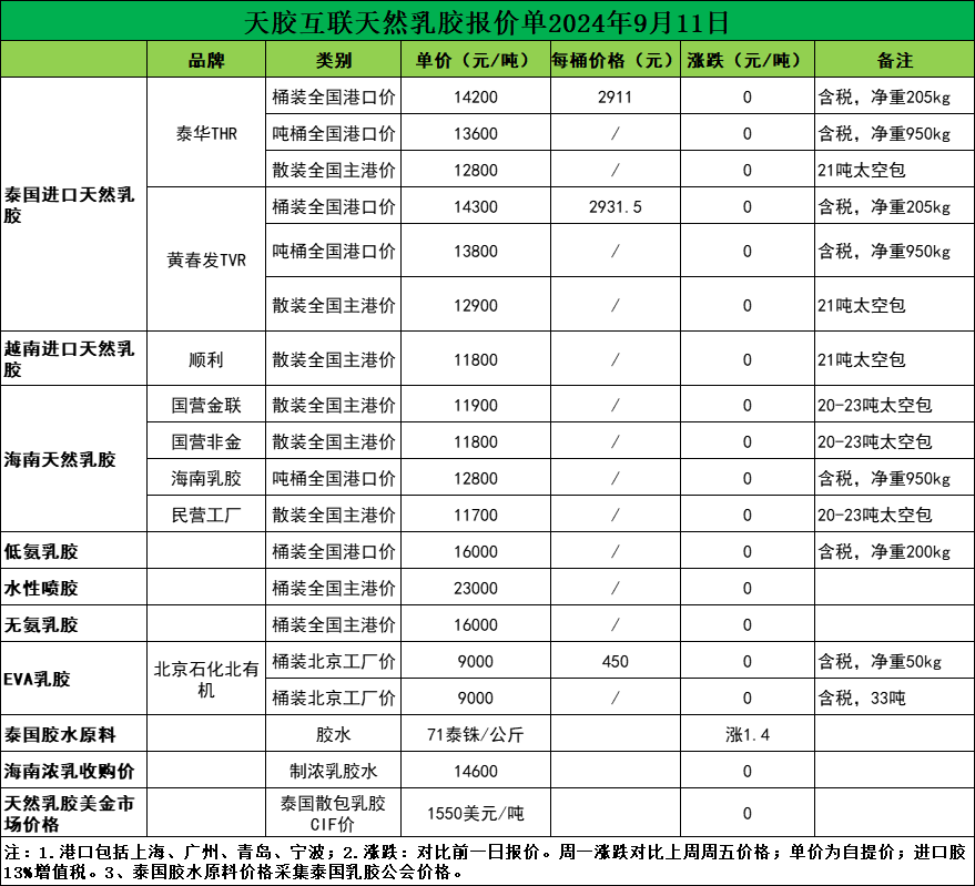价格涨跌不大!天然乳胶现货价格(2024.09.11)
