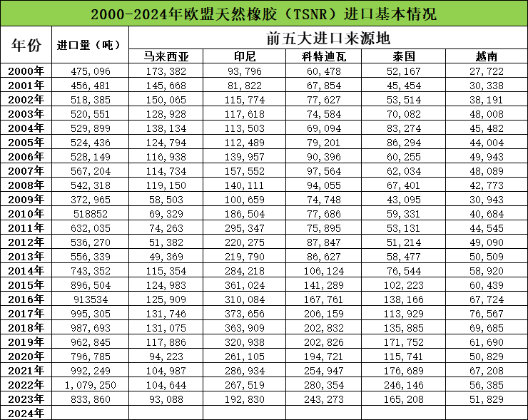 这两年搅动天然橡胶市场比较明显的是欧盟的EUDR,所以我们有必要了解一下欧盟的进口量。目前天然橡胶产量贸易主要是技术分类天然橡胶,即TSNR,海关HS编码是400122,也是欧盟主要需要进口的天然橡胶类比,占比90%以上。下面是欧盟从2000年-2024年TSNR天然橡胶进口量(数据来源world bank):