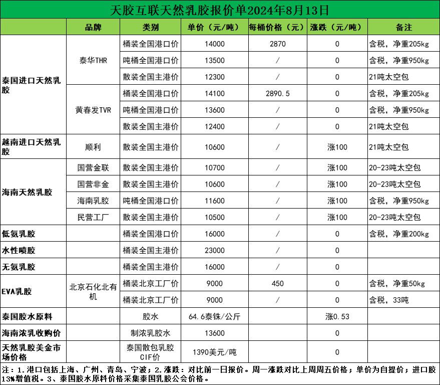 小幅涨价!天然乳胶现货价格(2024.08.13)