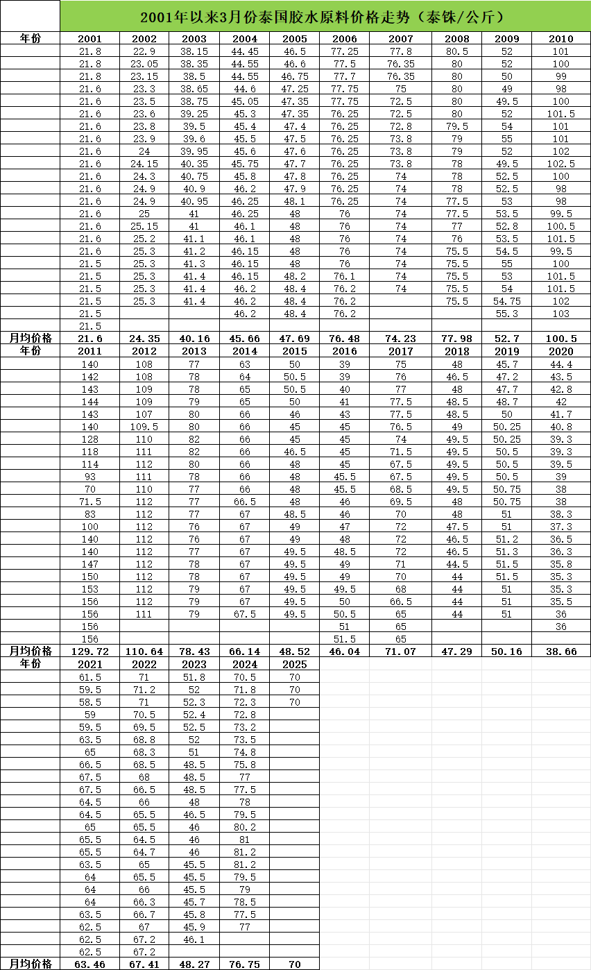 1、2001年以来,3月份价格变化也是蛮大。价格低位是21世纪初期,01年、02年才20泰铢左右,跟2月份价格差不多,这个价格至今没有。