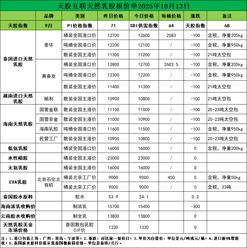 小幅降价!天然乳胶现货价格(2025.10.13)
