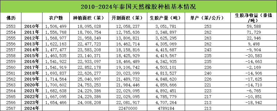 我们对之前泰国专题做了一些补充内容,新增了泰国天然橡胶种植农户数和净收益,同时修正了部分数据,本期我们以泰国国家农业数据中心的出版物为依据。以下是2010-2024年泰国天然橡胶种植基本情况: