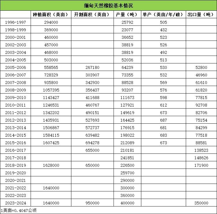此前我们已经分了多起剖析了包括泰国、印尼、科特迪瓦、越南、菲律宾、柬埔寨、印度等主产国的基本情况,现在我们继续分享1996年-2024年缅甸天然橡胶的种植、产量和出口情况,数据来源于缅甸商务部和国际贸易中心 (ITC) 共同编制的《RUBBER SECTOR STRATEGY》:
