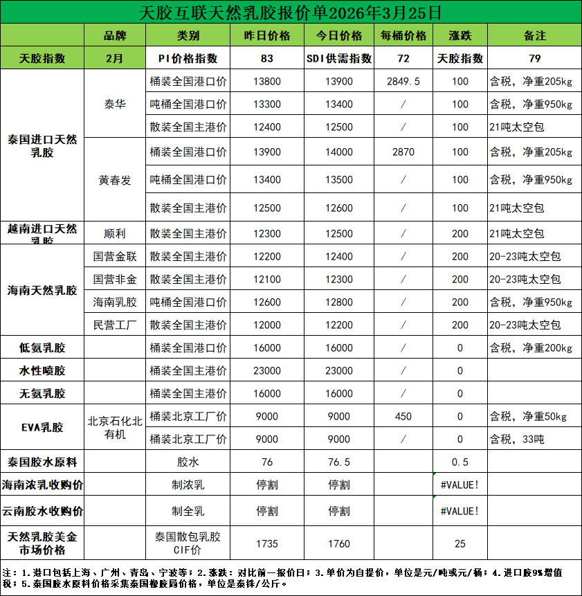 每吨涨价200元!天然乳胶现货价格(2026.03.25)