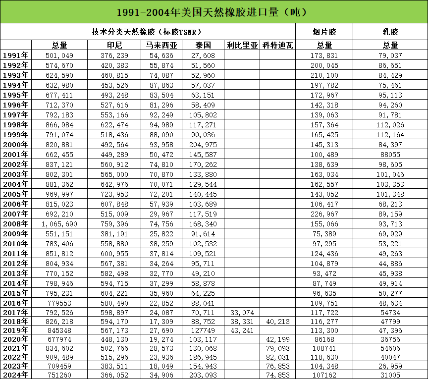 美国也是全球主要天然橡胶进口国。虽然泰国是全球主要出口国,但美国主要贸易伙伴不是泰国,而是印尼。以下是1991-2024年美国天然橡胶,包括标胶、烟片胶和乳胶的进口情况: