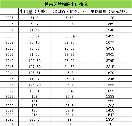 3、我们可以从出口单价得出来。2009年到2012年平均出口价格创了新高,其中2011年平均出口价高位,将近每吨4000美元左右。至今没有超越。长期来看,2015年到2023年,越南天然橡胶出口均价维持在1500美元/吨上下,形成了明显的底部价格区间。2024年已经出现一丝突破。