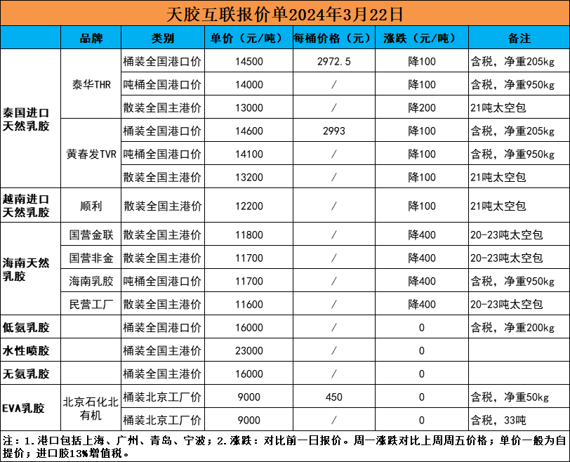 每吨降价100-400元不等!天然乳胶现货价格(2024.03.22)