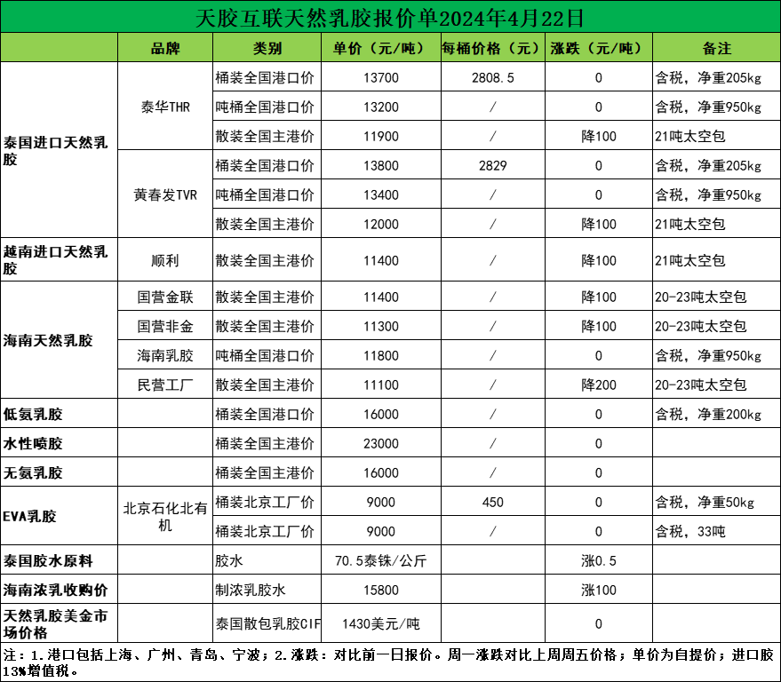 每吨降价100元!天然乳胶现货价格(2024.04.22)