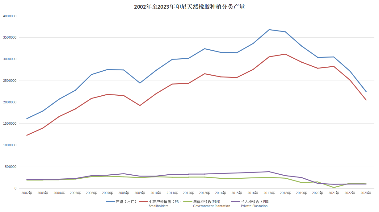 从这个图中我们很容易看到,印尼天然橡胶产量下降主要在于小农户种植园(PR)Smallholders产量的下降,印尼天然橡胶产量趋势跟小农户种植园产量趋势几乎一致。所以说印尼天然橡胶产量是成也小农户种植园,败也小农户种植园。