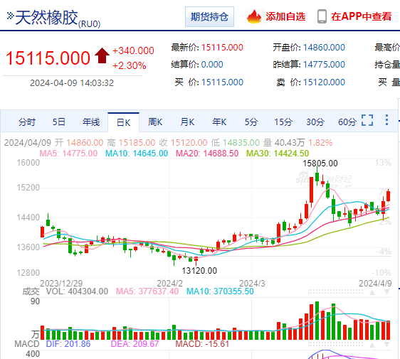 橡胶期货上演了节前跌,节后涨的行情。周一开盘就上涨,从低位时期的14500附近,已经涨到了目前快接近15200了。周一、周二两日的连续上涨,使得涨幅超过500点,而且再次突破15000整数关口。这是今年第2次突破15000了,两次冲上15000,反映出橡胶今年的炒作“异常凶猛”。