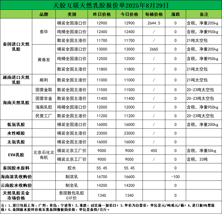 暂无变化!天然乳胶现货价格(2025.08.29)