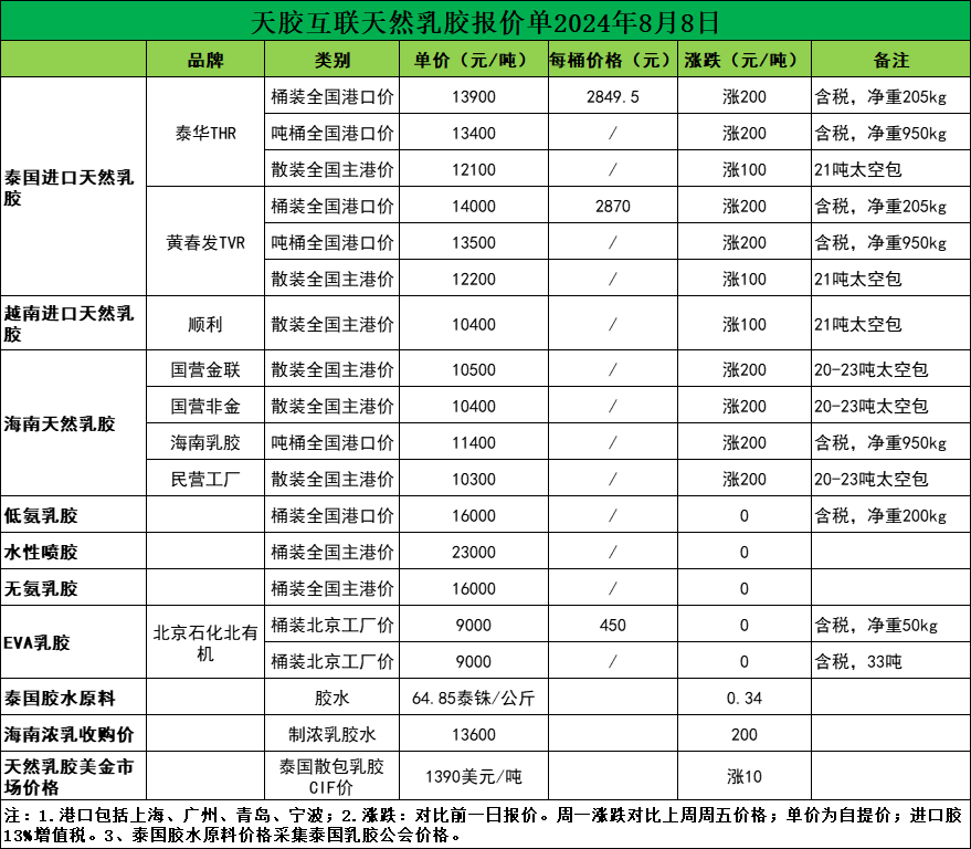 每吨涨价200元!天然乳胶现货价格(2024.08.08)