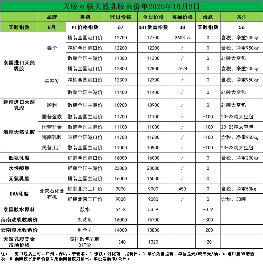 节后涨跌不大!天然乳胶现货价格(2025.10.09)