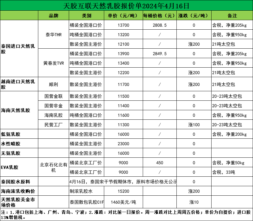 部分品牌小涨100-200元/吨!天然乳胶现货价格(2024.04.16)