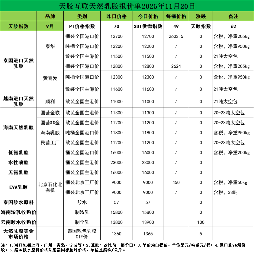 暂无变化!天然乳胶现货价格(2025.11.20)