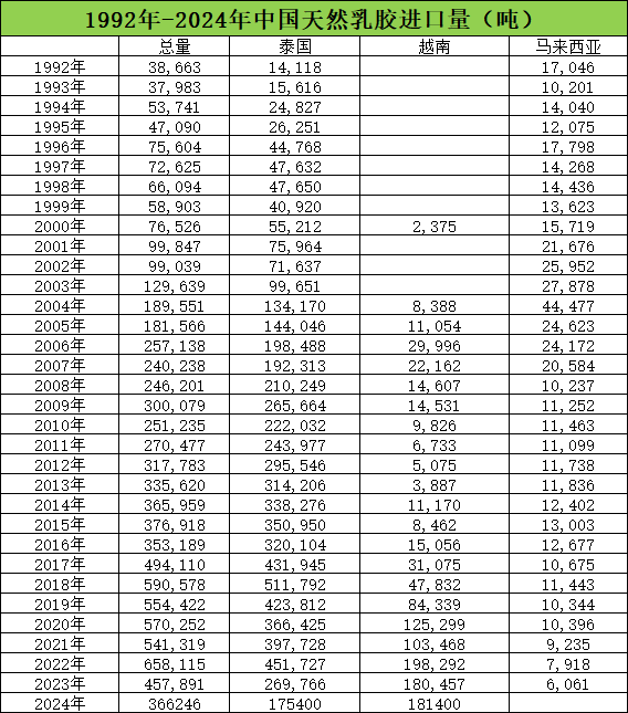 2、从进口来源国来看,从93年开始,泰国一直是我国天然乳胶进口主要合作伙伴,一直到24年才被越南超越。17年之后,中国从泰国进口量开始出现下降趋势。不过中国进口量总量没有变化,但是从泰国进口量开始下降了,主要原因在于从越南进口出现增长。