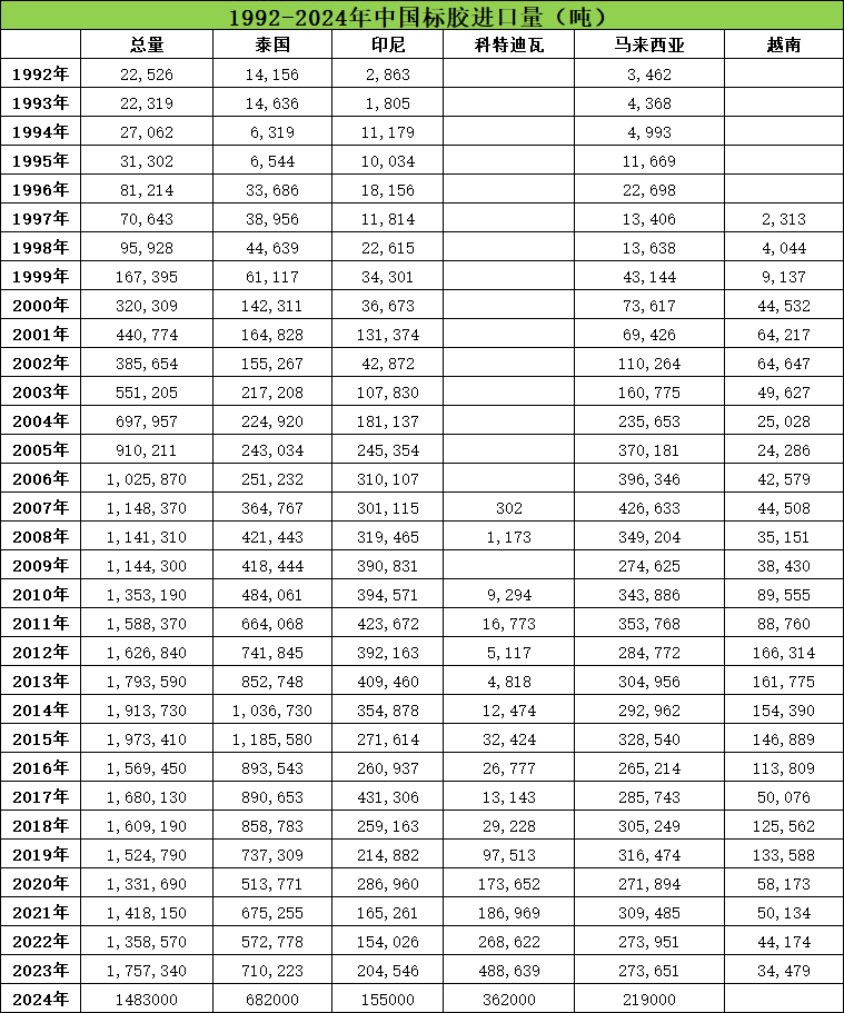 我们继续上期的内容,以下是1992-2024年中国标胶进口量变化: