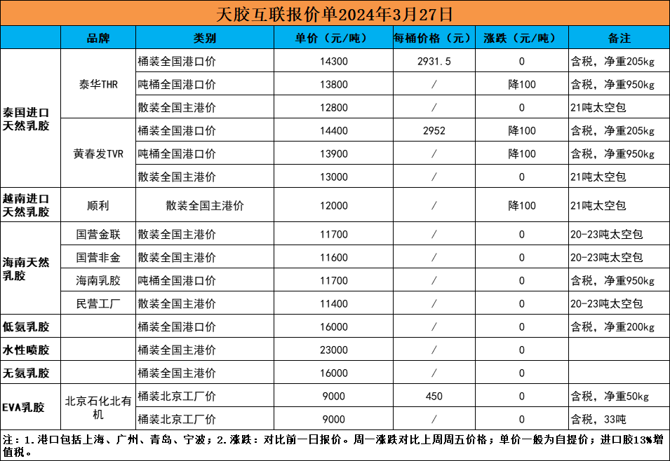 部分品牌降价100元/吨!天然乳胶现货价格(2024.03.27)