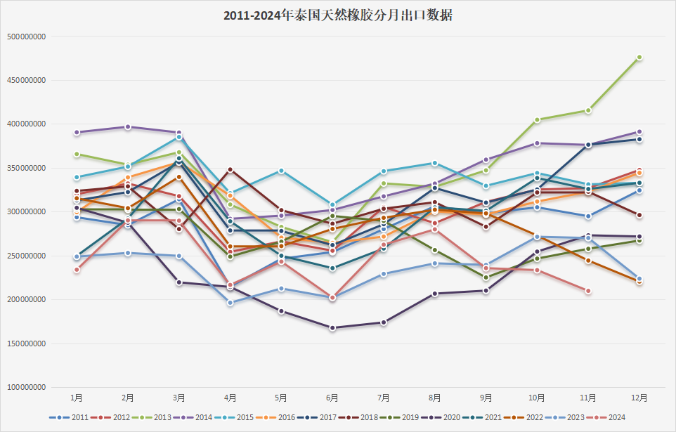 下图是泰国2011年至2024年分月天然橡胶出口数据: