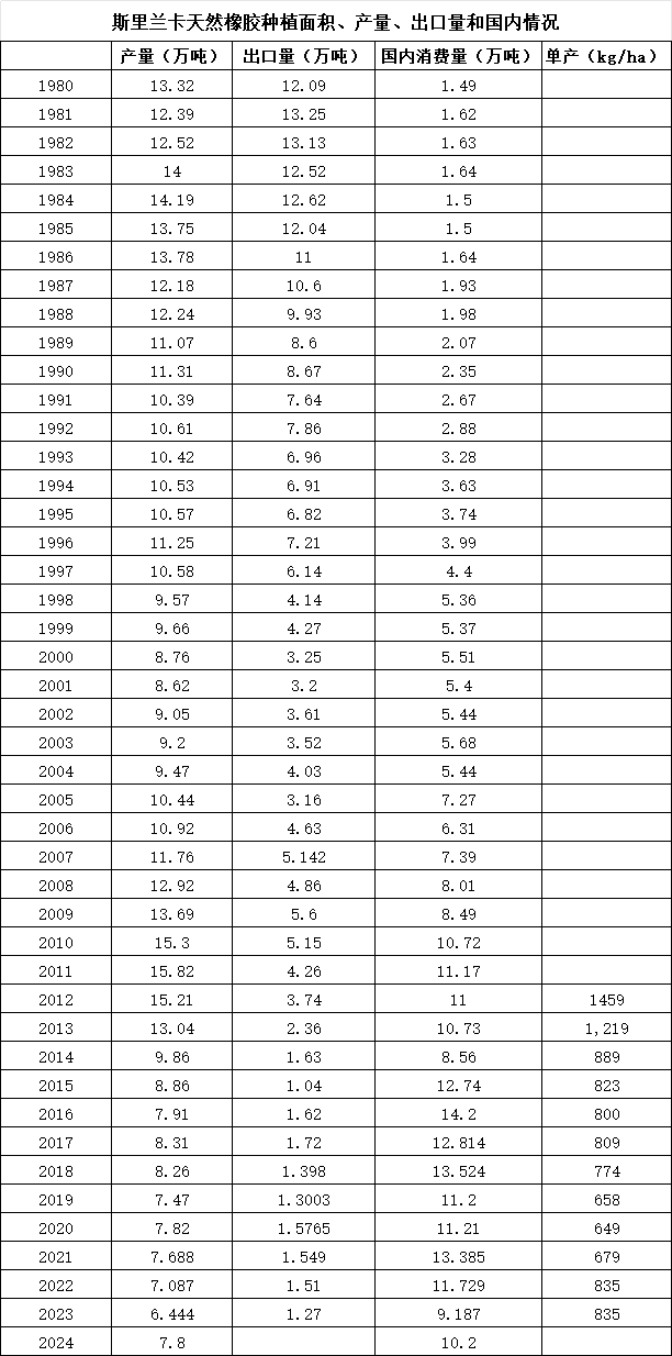 斯里兰卡关于天然橡胶有专门的统计归口,主要是橡胶研究所(Rubber Research Institute of SriLanka),我们就以斯里兰卡橡胶研究所的数据来分享斯里兰卡天然橡胶产量、出口和国内消费情况: