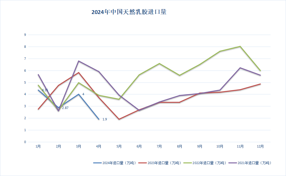 2024年4月中国进口天然乳胶1.9万吨,环比下降52%,同比下降49%!其中,从泰国进口1.4万吨,从越南进口0.42万吨。