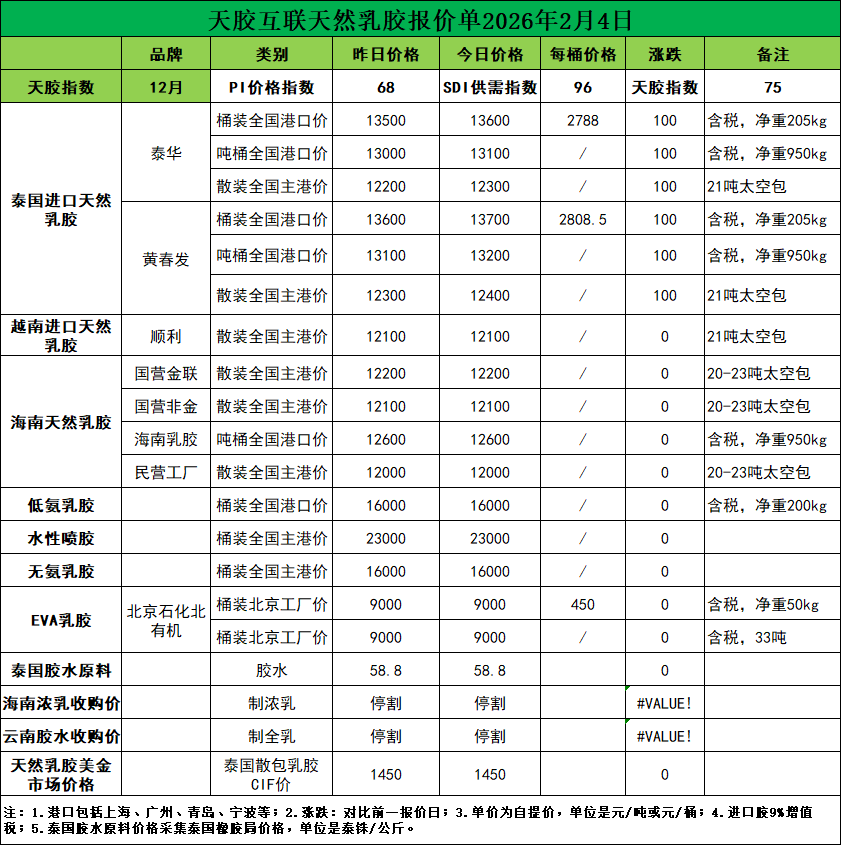 每吨涨价100元!天然乳胶现货价格(2026.02.04)